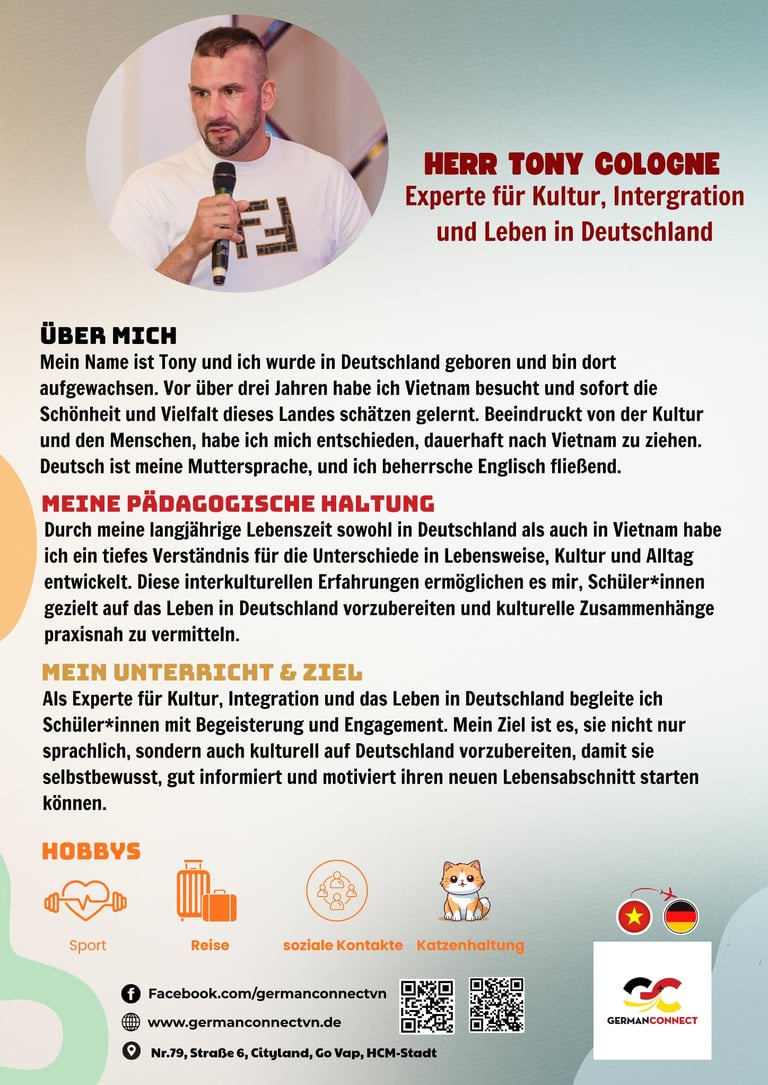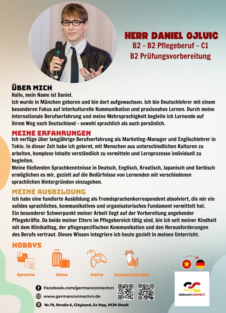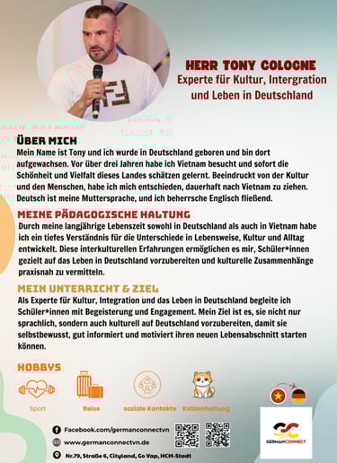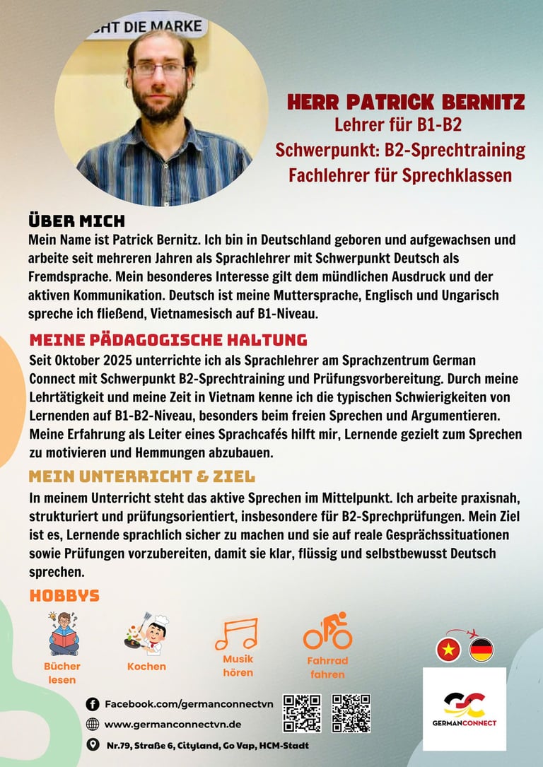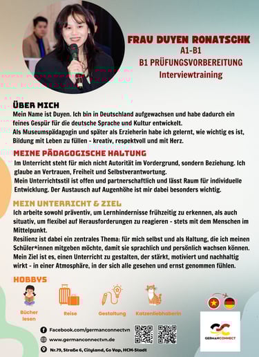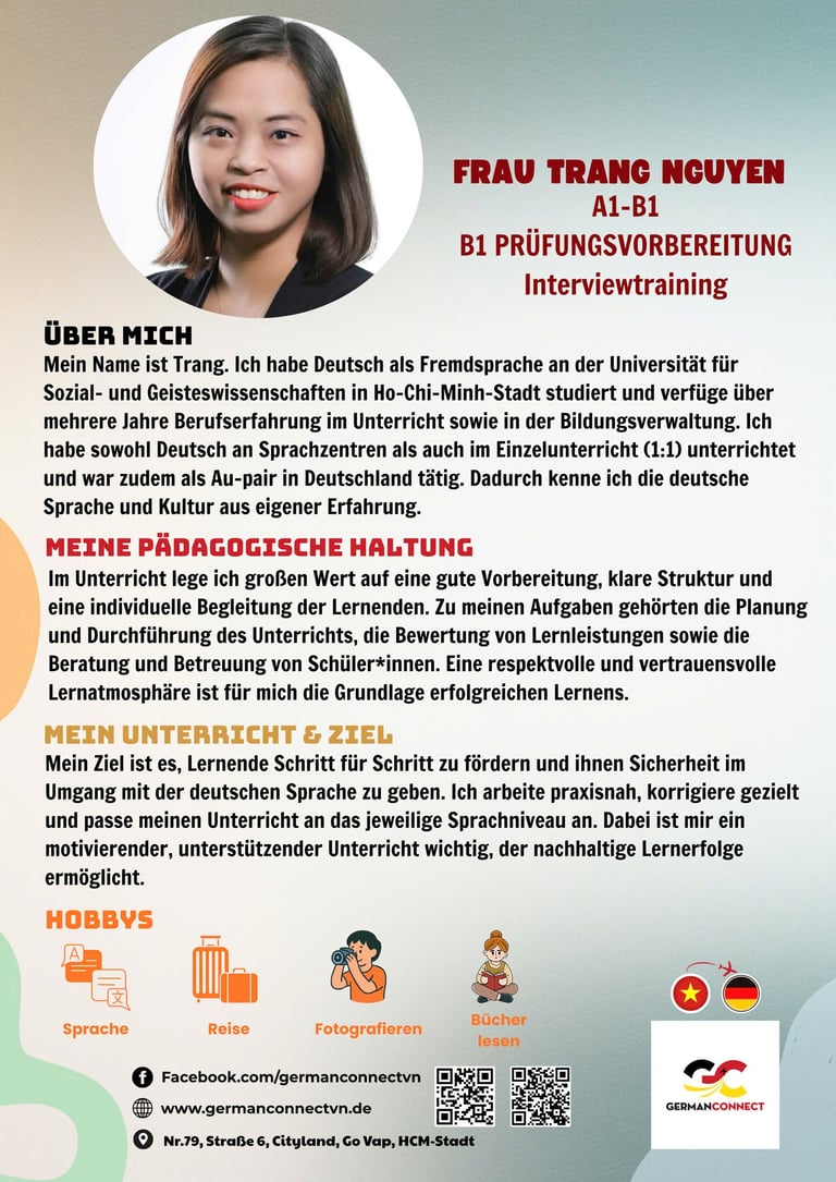 German Connect ist eine spezialisierte Sprach- und Bildungseinrichtung, die junge Menschen aus Vietnam gezielt auf ihre Ausbildung und berufliche Zukunft in Deutschland vorbereitet. Unsere Sprachschule bietet hochwertige Deutschkurse von A1 bis C1, praxisnahe Fachsprachvorbereitung sowie individuelle Beratung für Bewerbungs- und Visumsprozesse.